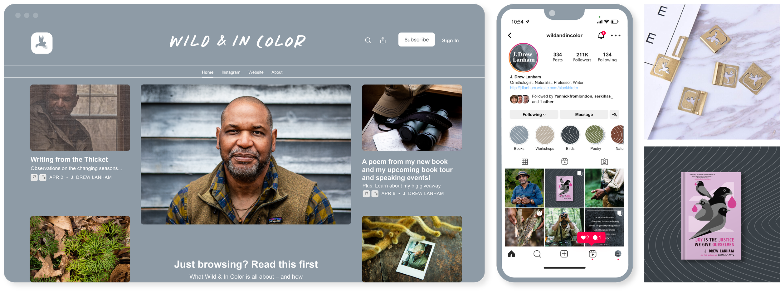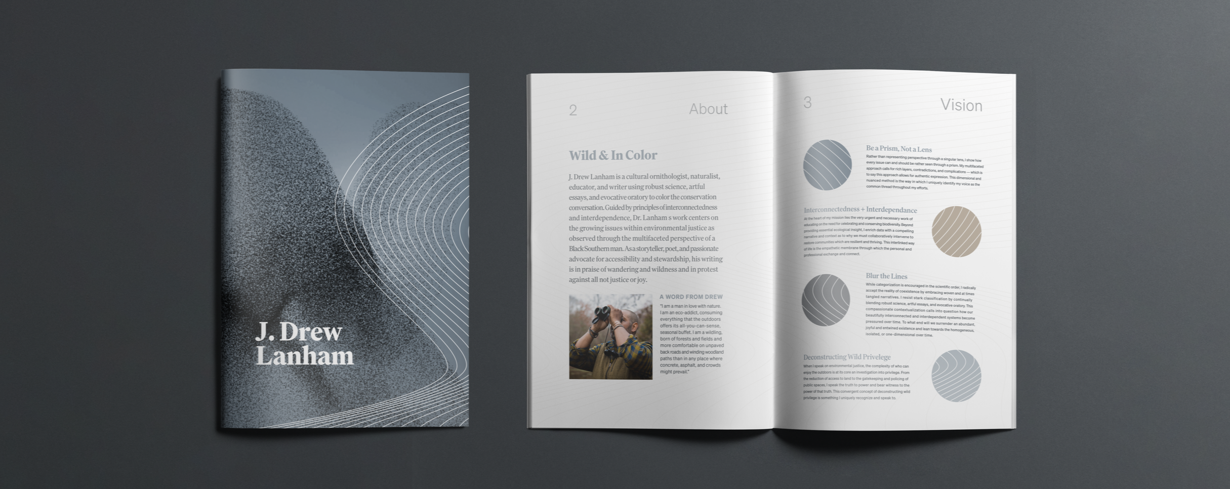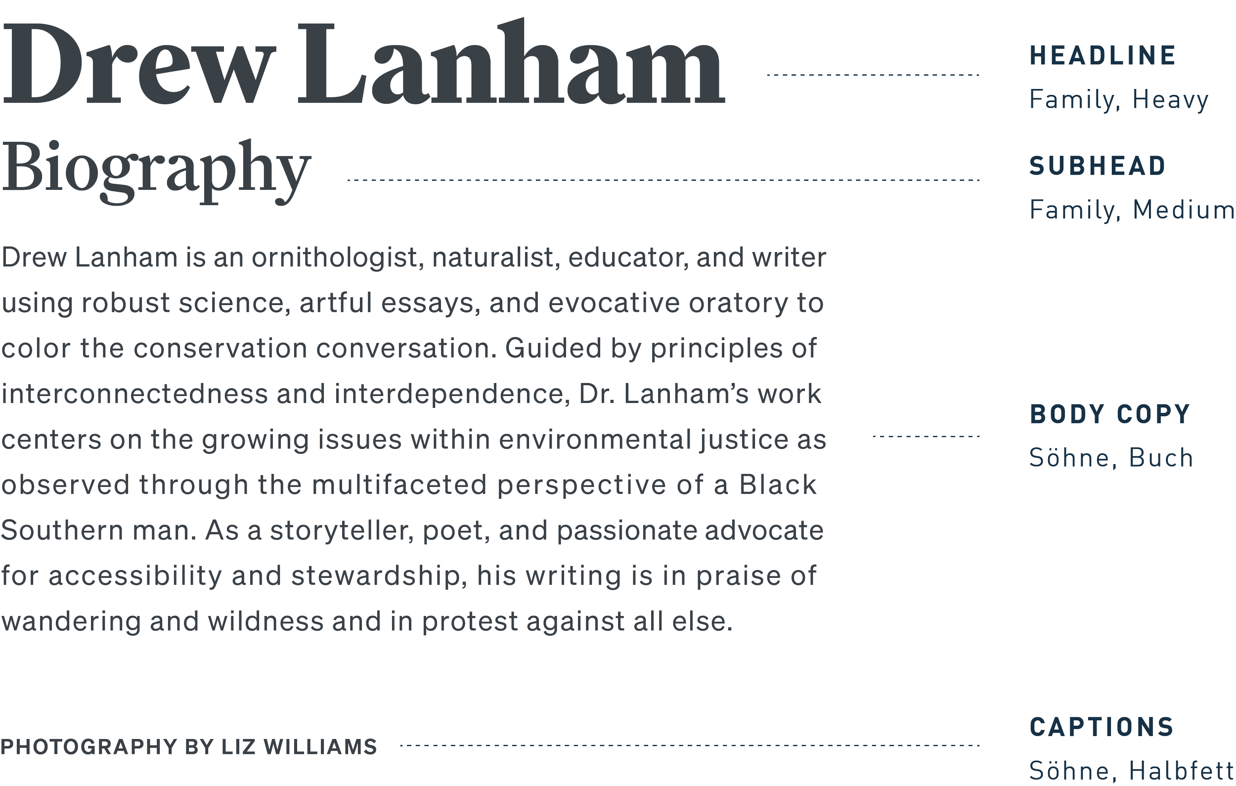 Drawing inspiration from murmurations and migratory patterns, this visual style captures the poetic beauty found in the tangled paths of wild and untethered birds. Through observation and depth of attention, J. Drew Lanham’s work similarly weaves and layers science and art to best reflect the joy and truth of our interconnected stories. The aesthetic is grounded in a nature-rooted color palette, paired with warm portraits of Drew in his natural habitat of upstate South Carolina.