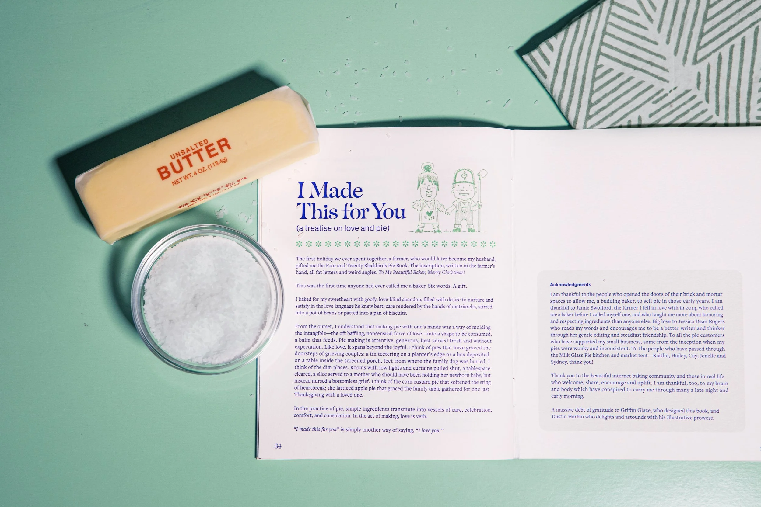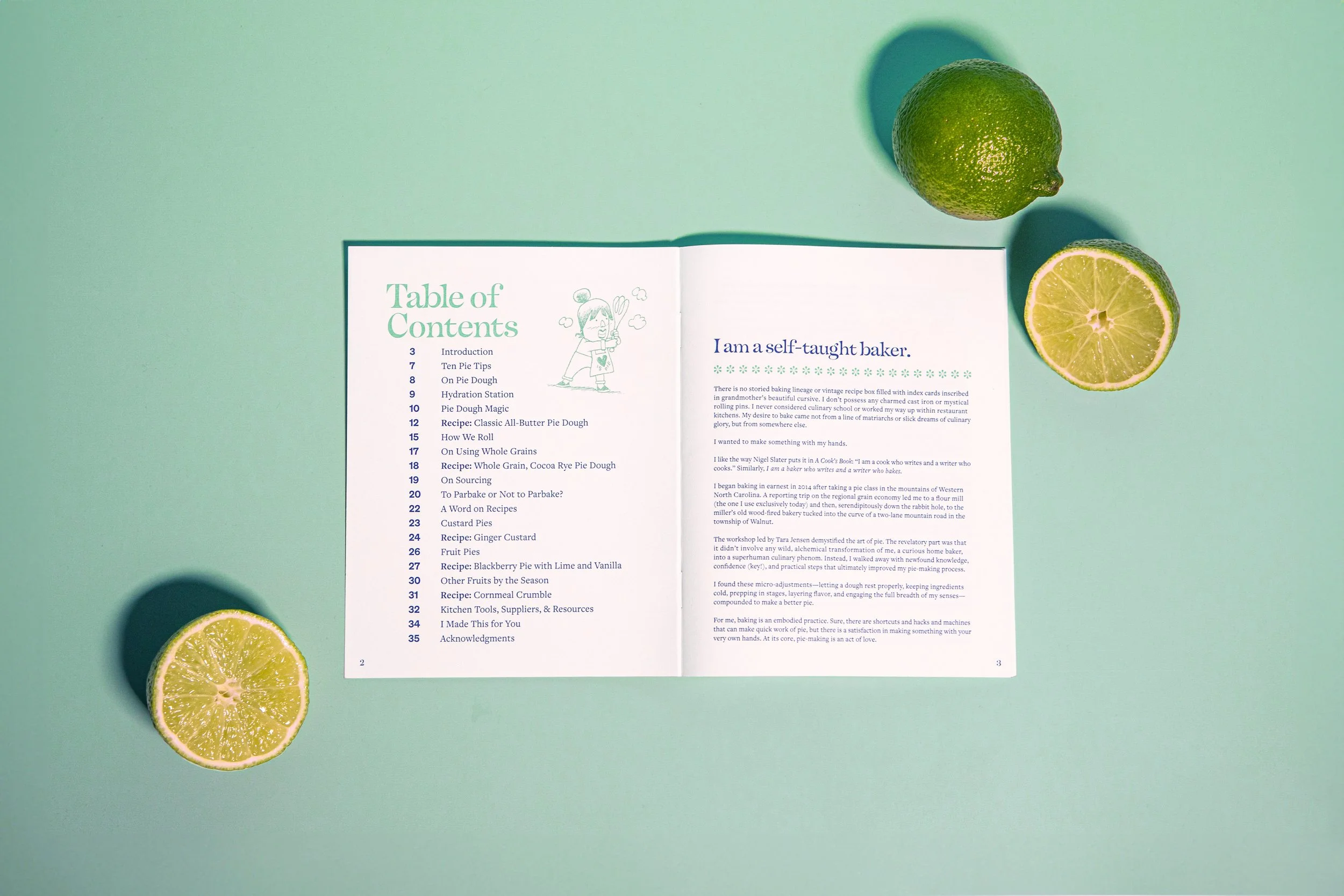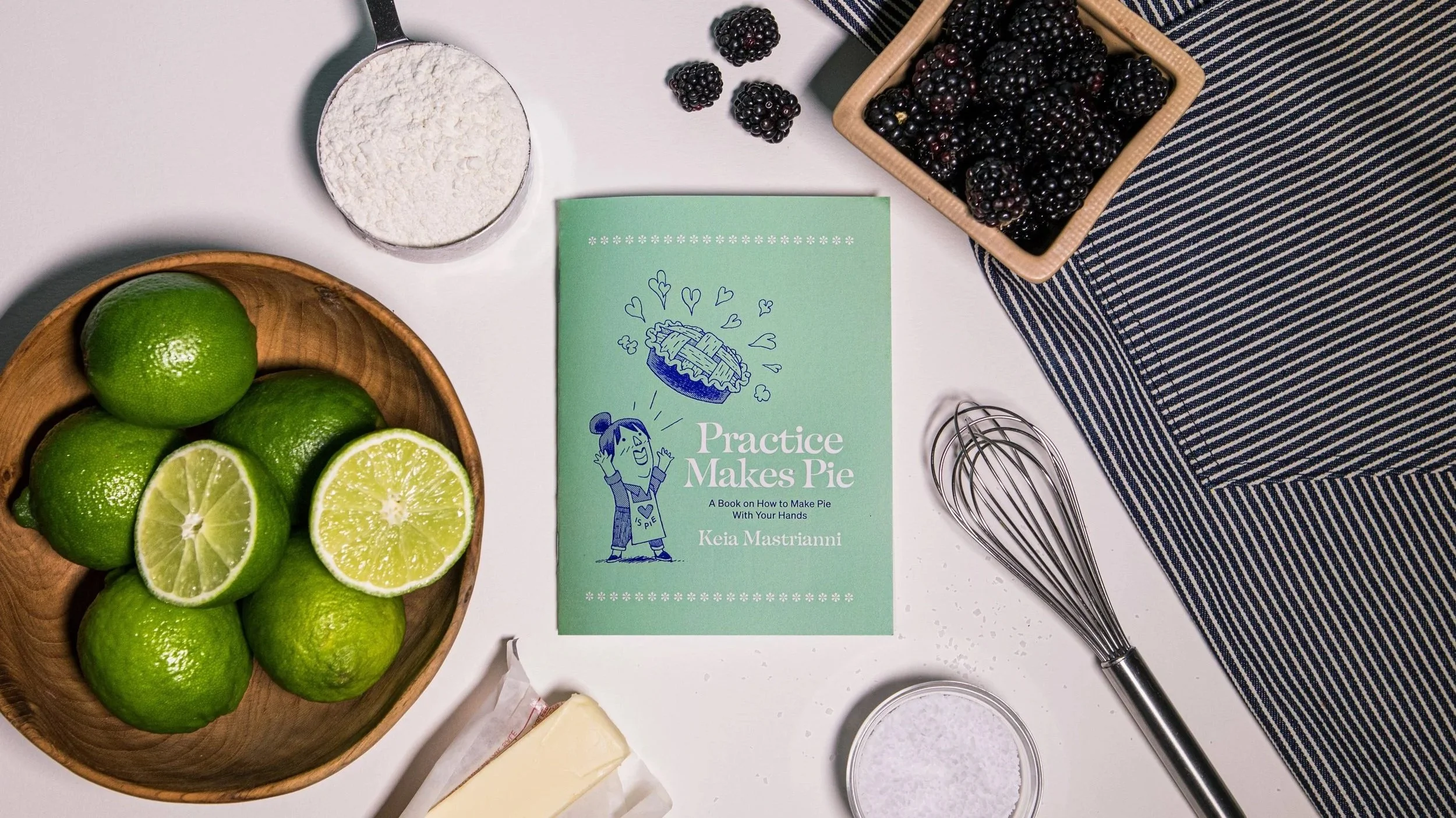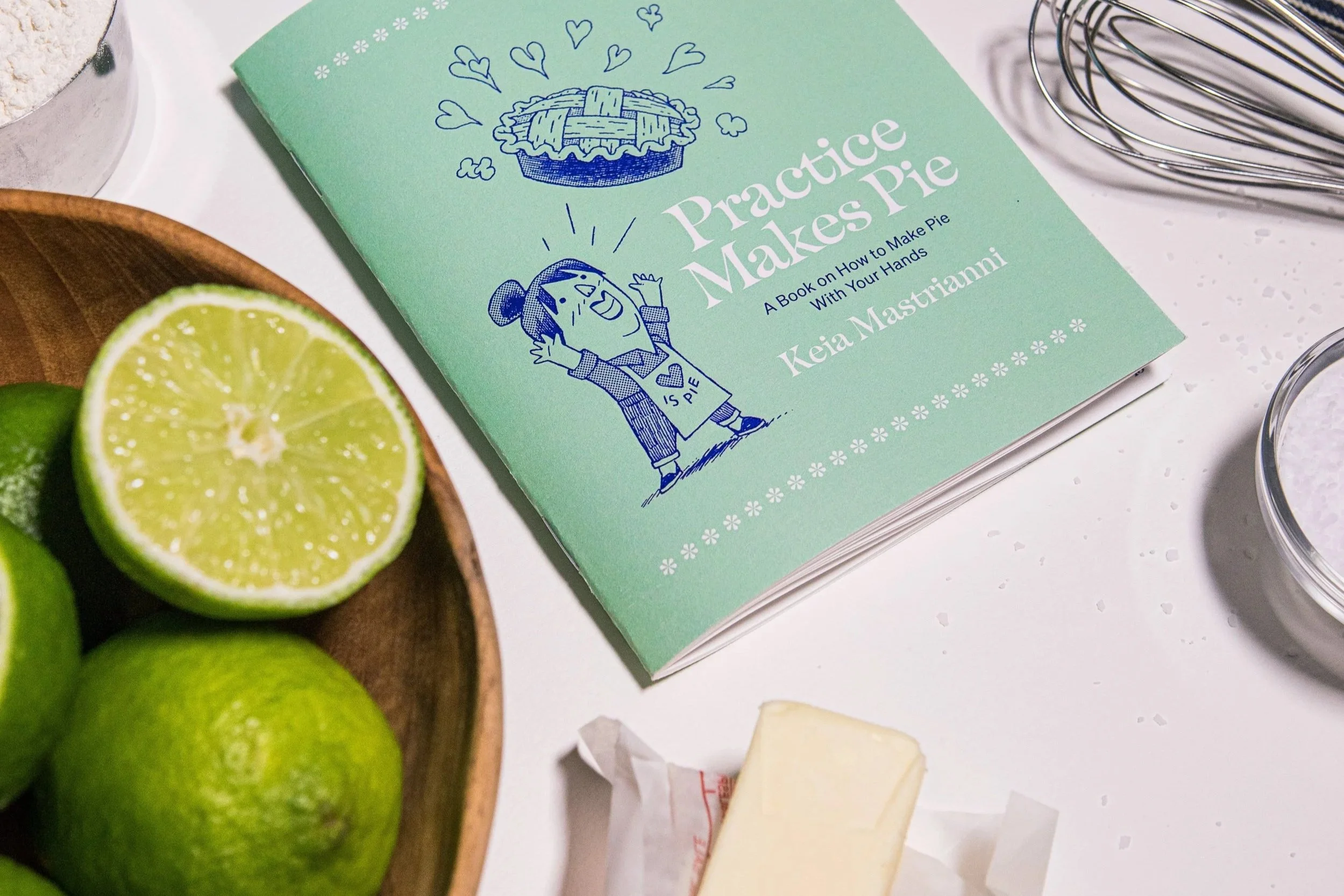Practice Makes Pie is a 35-page zine by Milk Glass Pie baker, Keia Mastrianni, sharing the pie wisdom she’s gathered over years as a self-taught baker. Inside are six delicious recipes, plenty of variations, and a gentle nudge to trust your hands and make the pie your own. Designed to feel like a well-loved kitchen companion, the zine pairs the easy usefulness of a cookbook with a loose, handcrafted spirit, printed on toothy paper and filled with delightful illustrations by Dustin Harbin. It’s a small, joyful ode to the simple magic of making pie.